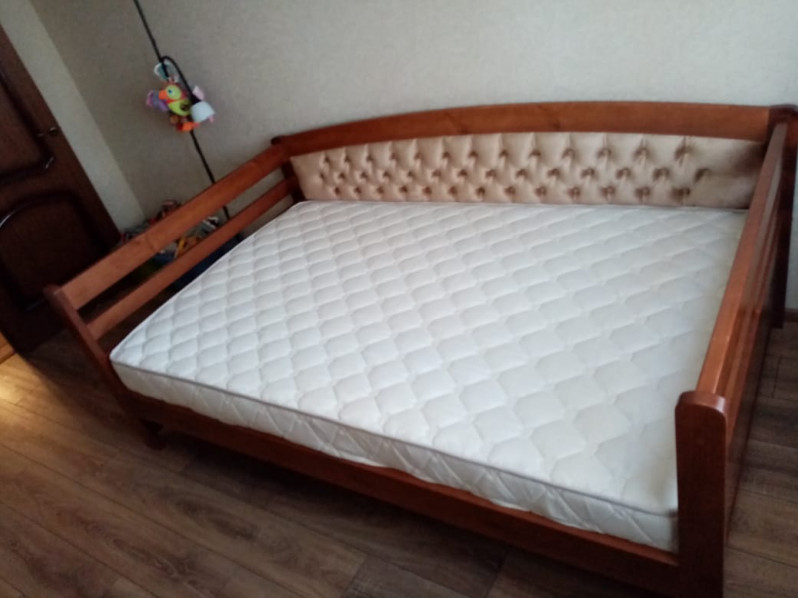 Кровать с мягким изголовьем из натурального дерева Верона, массив сосны, цвет вишня 3. Изделие укомплектовано матрасом с ортопедическим эффектом.